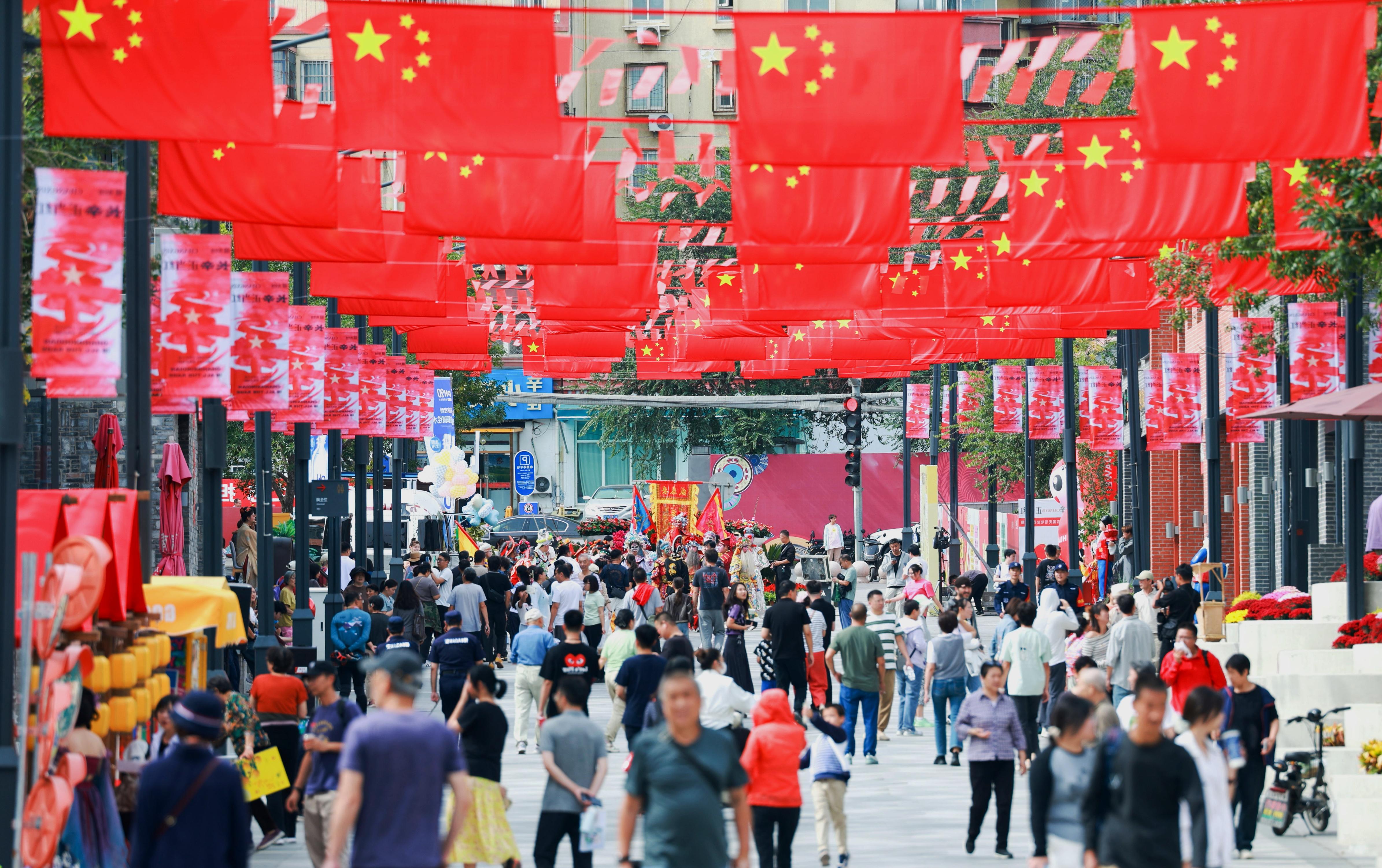 10月1日,北京市丰台区长辛店国潮时尚街区的“国旗大道”上游人如织。本报记者 靳祖保 摄