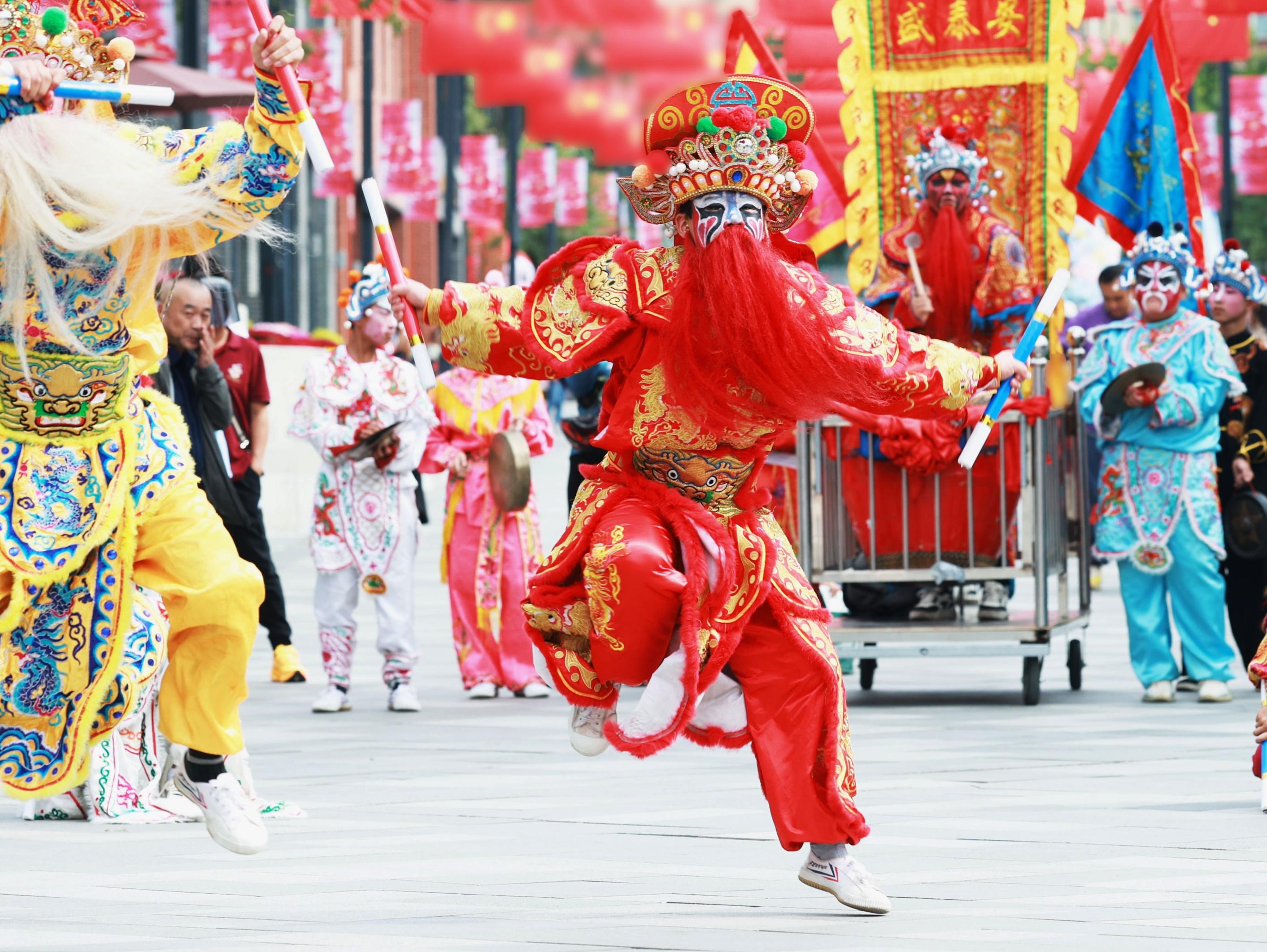 10月1日,在北京市丰台区长辛店国潮时尚街区,“又炫又燃”的英歌舞表演引人注目。本报记者 靳祖保 摄