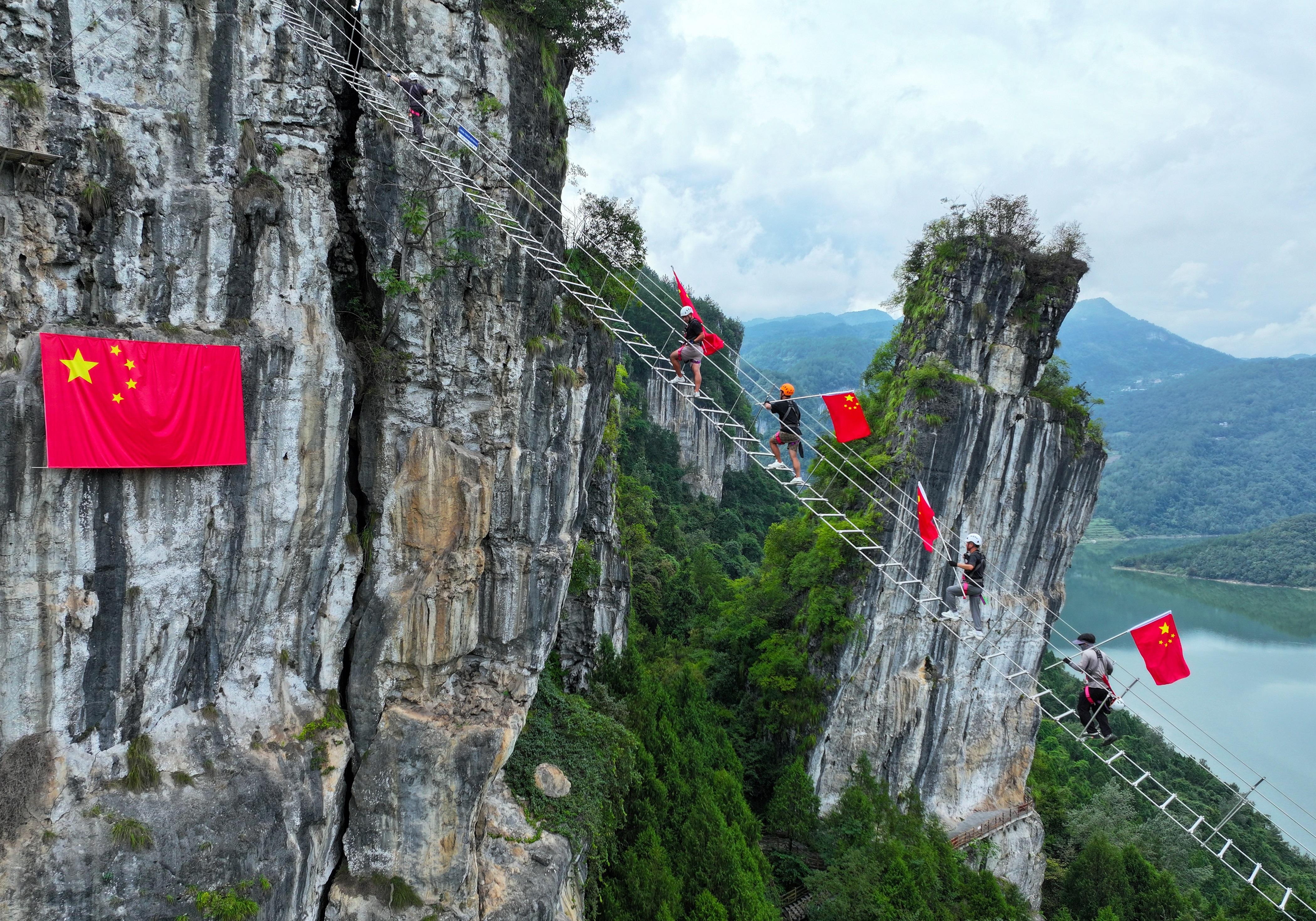 10月1日,在湖北省恩施市新塘乡红花峰林景区,游客手持国旗体验户外运动“飞拉达”。民建会员 张远明 摄