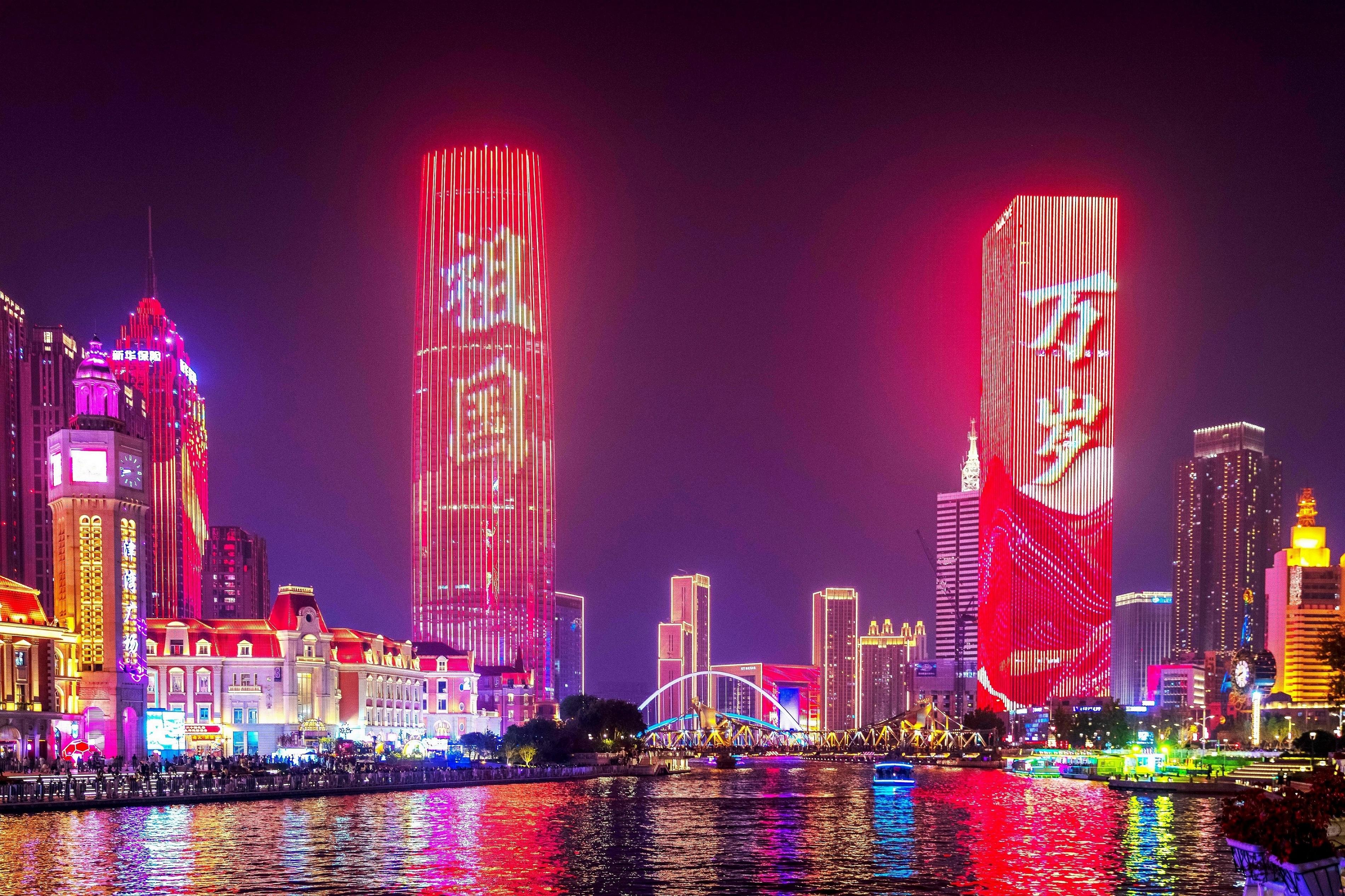 10月7日,夜景灯光秀在天津海河之畔上演。九三学社社员 陈金松 摄