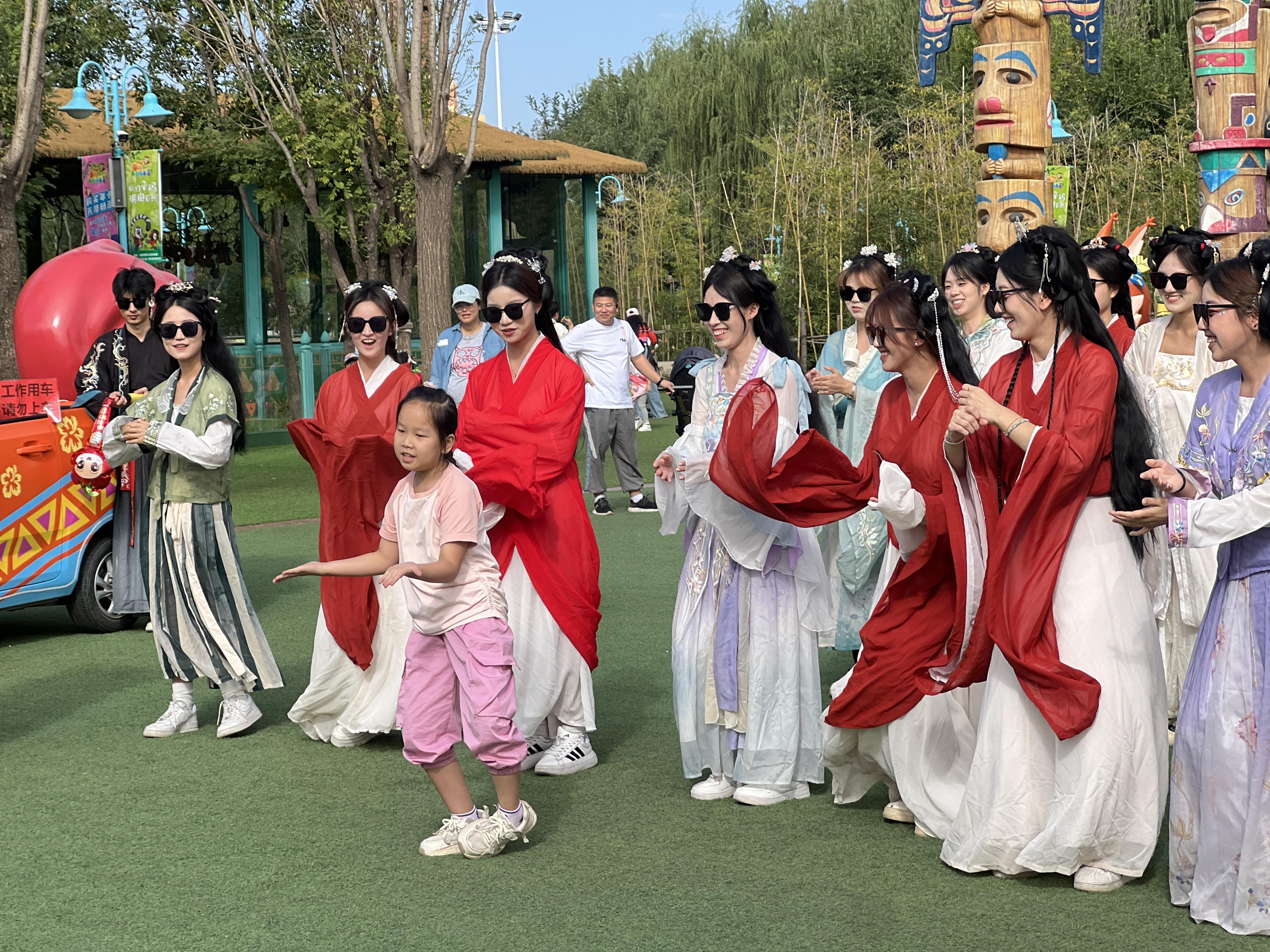 10月2日,在河北雄安辛玛森林动物乐园,一场国风舞蹈快闪表演正在进行。本报记者 吴姝静 摄
