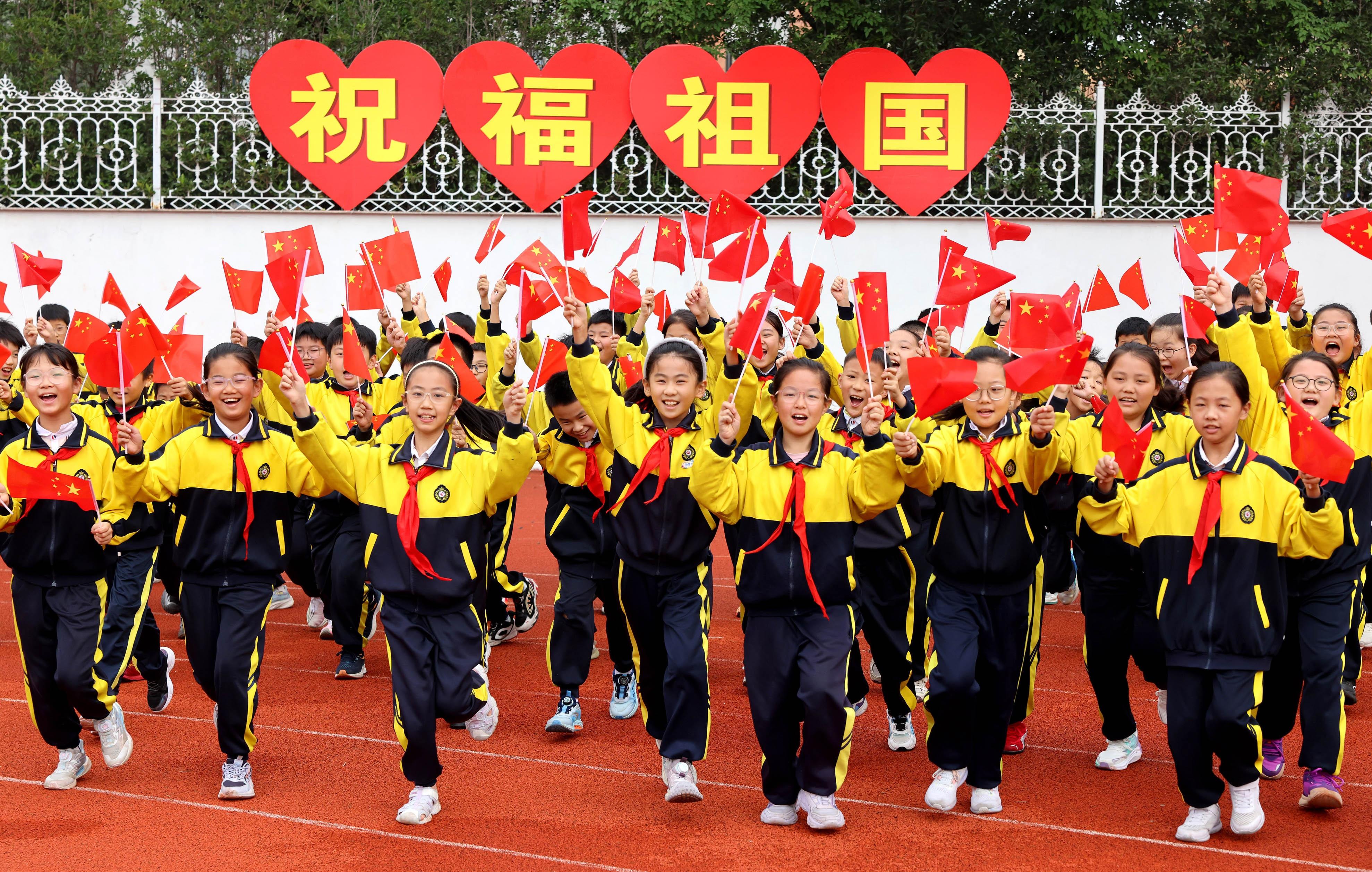 9月29日,在山东省枣庄市市中区文化路小学,学生们参加“祝福祖国”活动。吉 喆 摄