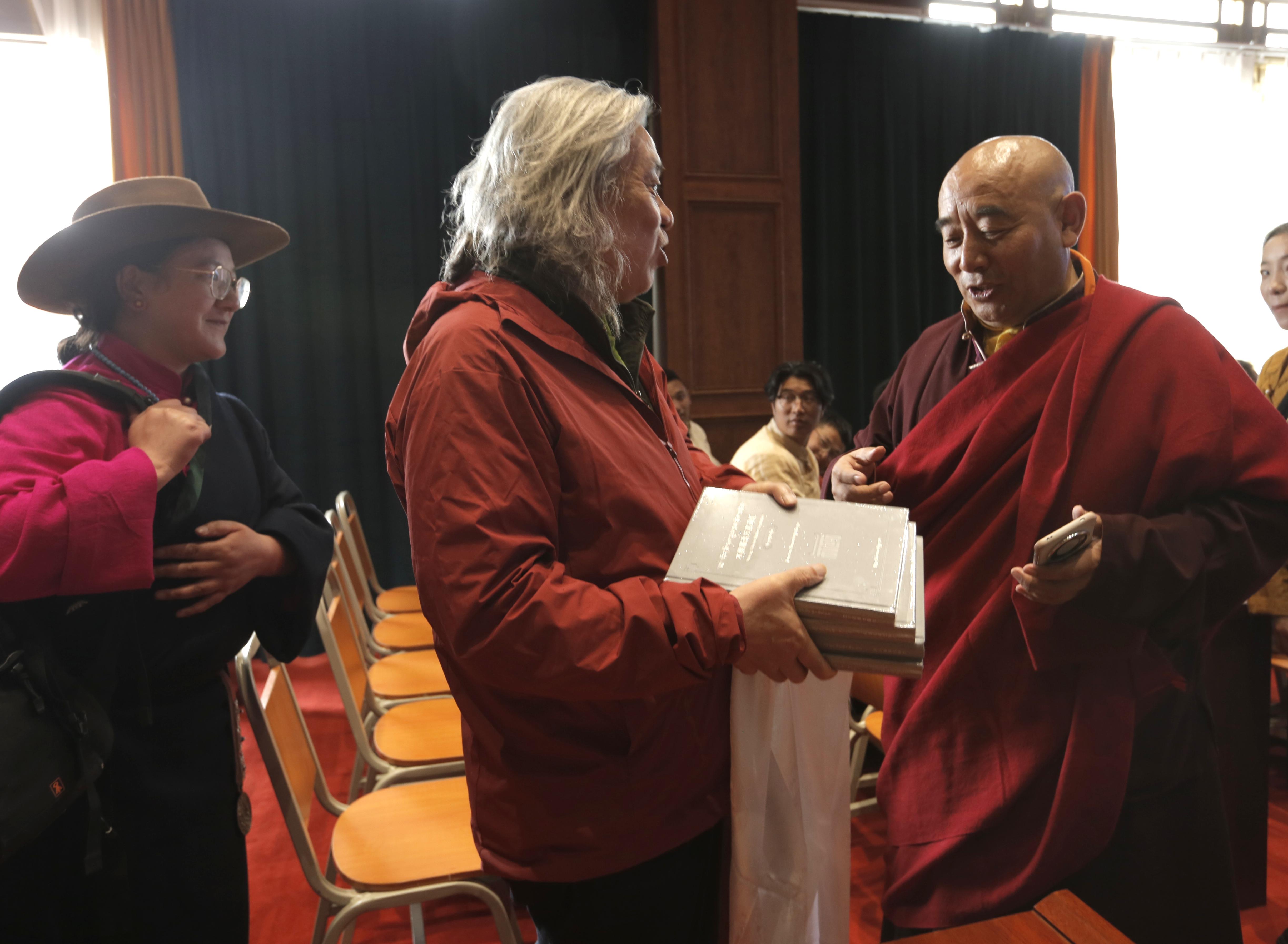 林强向甘孜藏族自治州政协副主席多吉扎西赠送《木雅藏语方言词汇》。