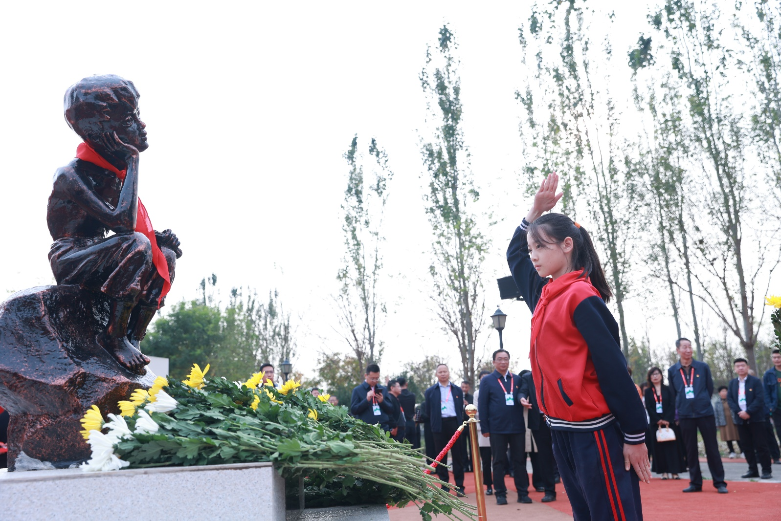 揭幕仪式上,在庄严的国歌声中,革命烈士“小萝卜头”(宋振中)的哥哥宋振镛老人亲临现场,并为来宾签名赠送《红岩》一书。北臧村镇党委书记张华义与宋振镛老人共同为雕塑揭幕。少年儿童们以献词的形式,向革命先烈表达了他们最深切的敬意和怀念。随着纪念号角的响起,全体人员向为国家解放和建设事业英勇献身的烈士们默哀,致以崇高的敬意和缅怀。