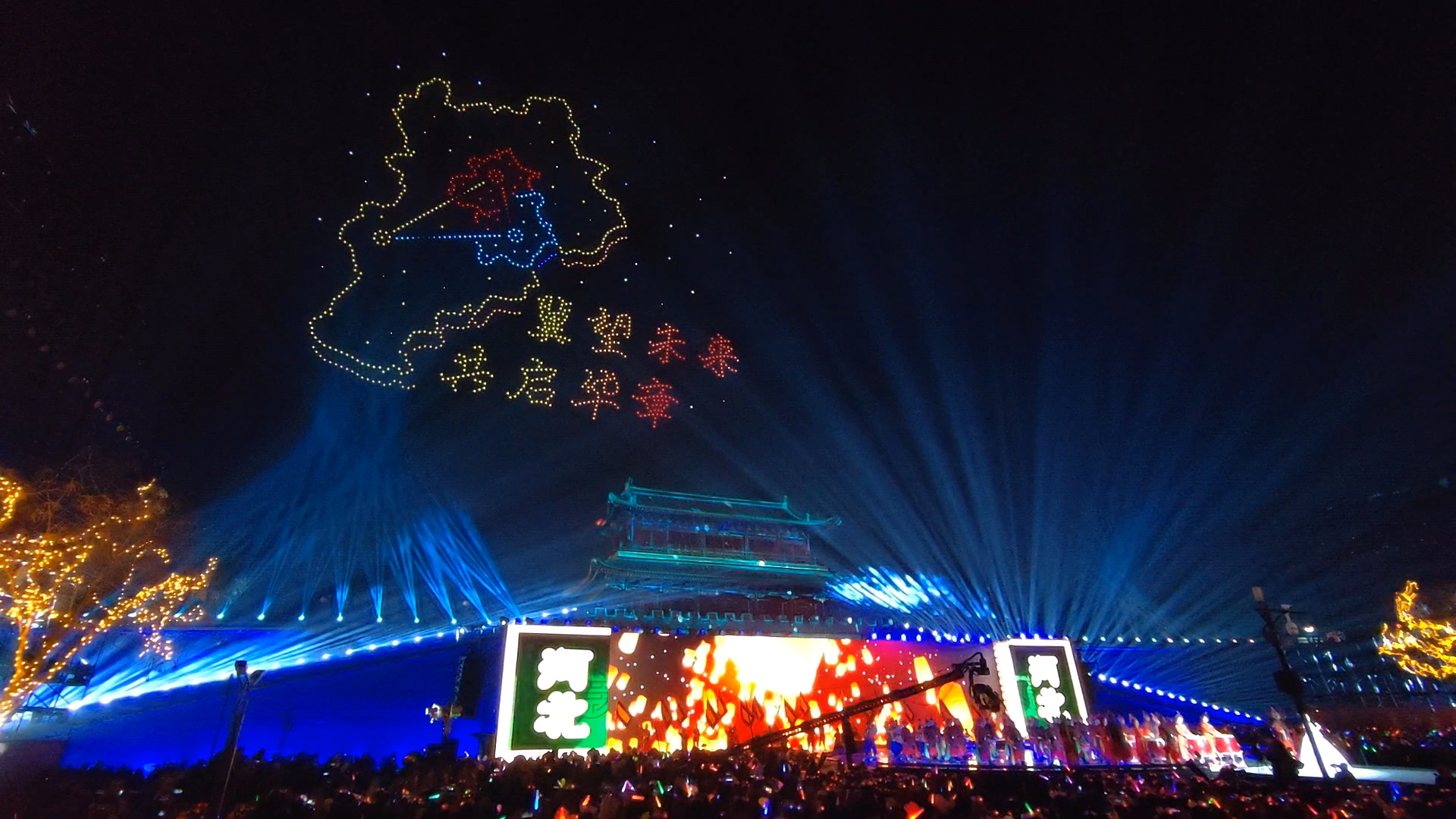 本次活动以正定古城南城门为核心区域,搭建以“瓣瓣同心”为理念设计的圆形舞台,运用无人机、LED大屏、光影、声光电等先进技术营造山河相连的壮美景象,千余架无人机表演直冲苍穹、变换万千,北京天安门,天津五大道,河北雄安新区、正定古城等画面随着“你好,北京!”“你好,天津!”“冀望未来 共启华章”“2025新年快乐”等文字内容闪耀夜空。