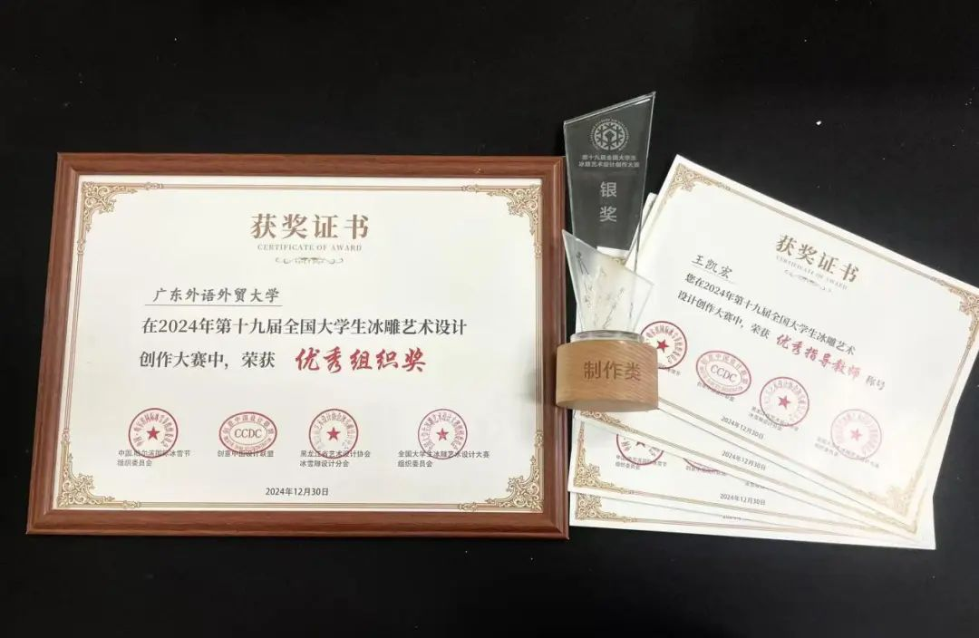 2024年12月28日至30日,“第十九届全国大学生冰雕艺术设计创作大赛”在哈尔滨举办。民革广东省委会委员、广东中山文化艺术中心主任、广东外语外贸大学艺术学院院长王凯宏,带领广东外语外贸大学艺术学院团队创作的作品在众多佳作中脱颖而出,荣获“制作类银奖”。王凯宏等三位教师获“优秀指导老师奖”。
