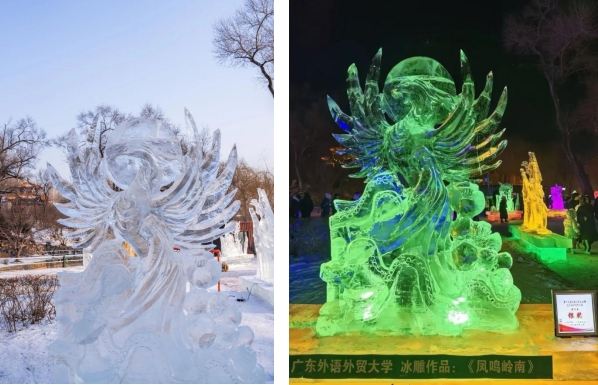 作为广东省唯一入围的代表队,该团队带来了独具岭南特色的冰雕作品——《凤鸣岭南》:一只凤凰傲然挺立在岭南大地之上,展翅高歌,其羽翼丰满,姿态矫健,仿佛正欲振翅高飞,直冲云霄。凤凰的周围,点缀着岭南特色建筑镬耳屋的轮廓、广州市花木棉花。这些元素与冰雕的纯净与高雅相得益彰,共同构成了一幅既富有地域特色又充满艺术感染力的画面。作品独特的创意和巧妙的设计赢得了评委和各参与团队的赞赏。王凯宏表示,“作品以广东外语外贸大学校歌《凤鸣岭南》为主题,将校歌寓意与岭南文化精妙地结合,通过冰雕这一艺术形式,生动展现了广外的特色、精神以及岭南文化的魅力。”