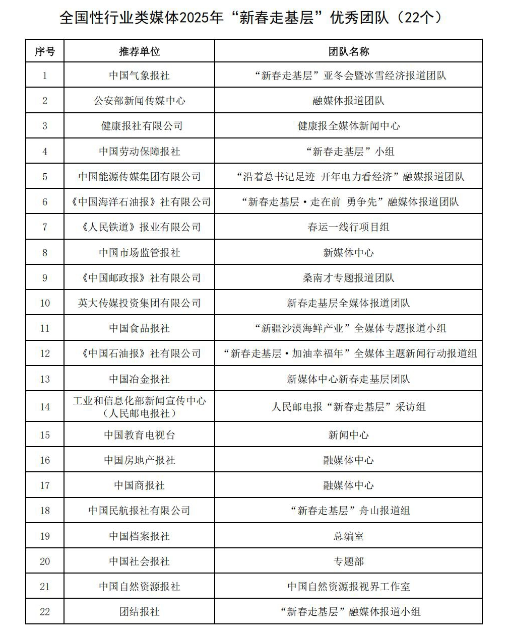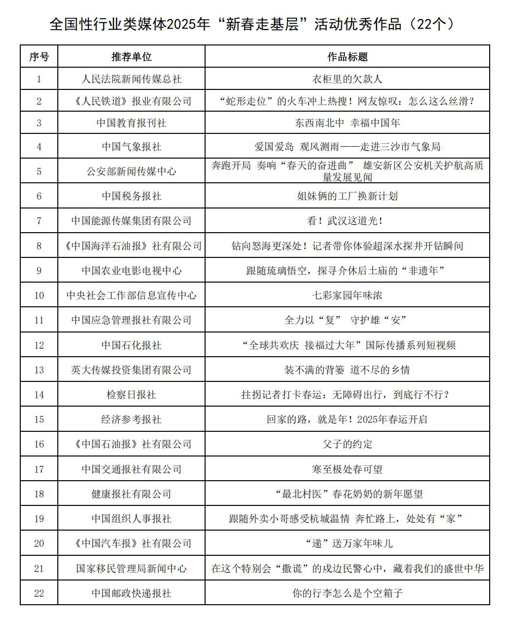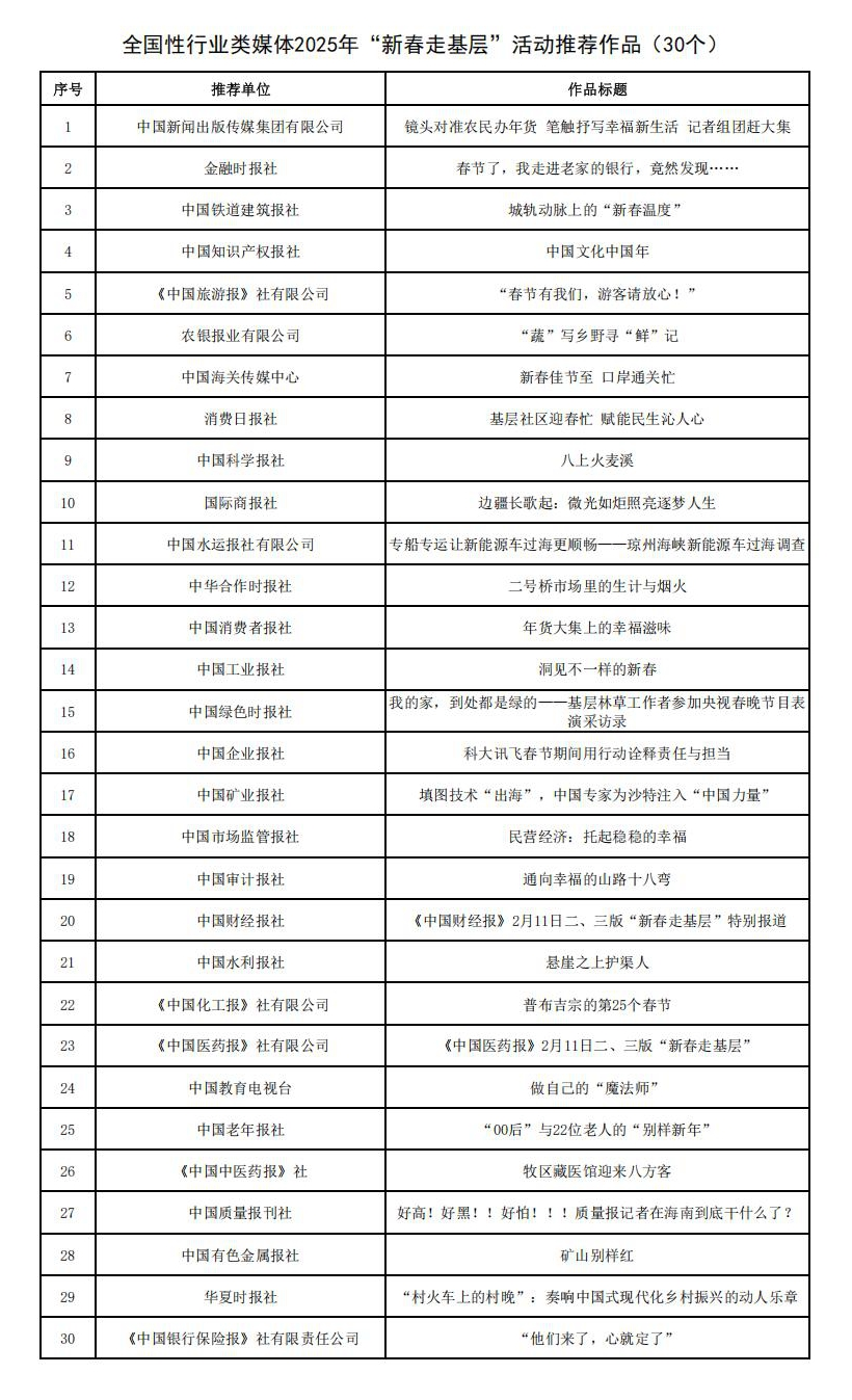 全国性行业类媒体主要负责同志和业务骨干近80人参加会议。中国行业报协会、人民法院新闻传媒总社、中国气象报社、《人民铁道》报业有限公司、公安部新闻传媒中心、中国能源传媒集团有限公司、中国教育报刊社、中国应急管理报社有限公司、中国石化报社、中国交通报社有限公司主要负责同志作了交流发言,分享2025年“新春走基层”活动推动创制精品力作、培育全媒体传播人才、增强“四力”改进文风情况等。会议发布了全国性行业类媒体2025年“新春走基层”活动优秀案例,22个团队入选全国性行业类媒体2025年新春走基层活动“优秀团队”,22件作品入选全国性行业类媒体2025年新春走基层活动“优秀作品”,30件作品入选全国性行业类媒体2025年新春走基层活动“推荐作品”。