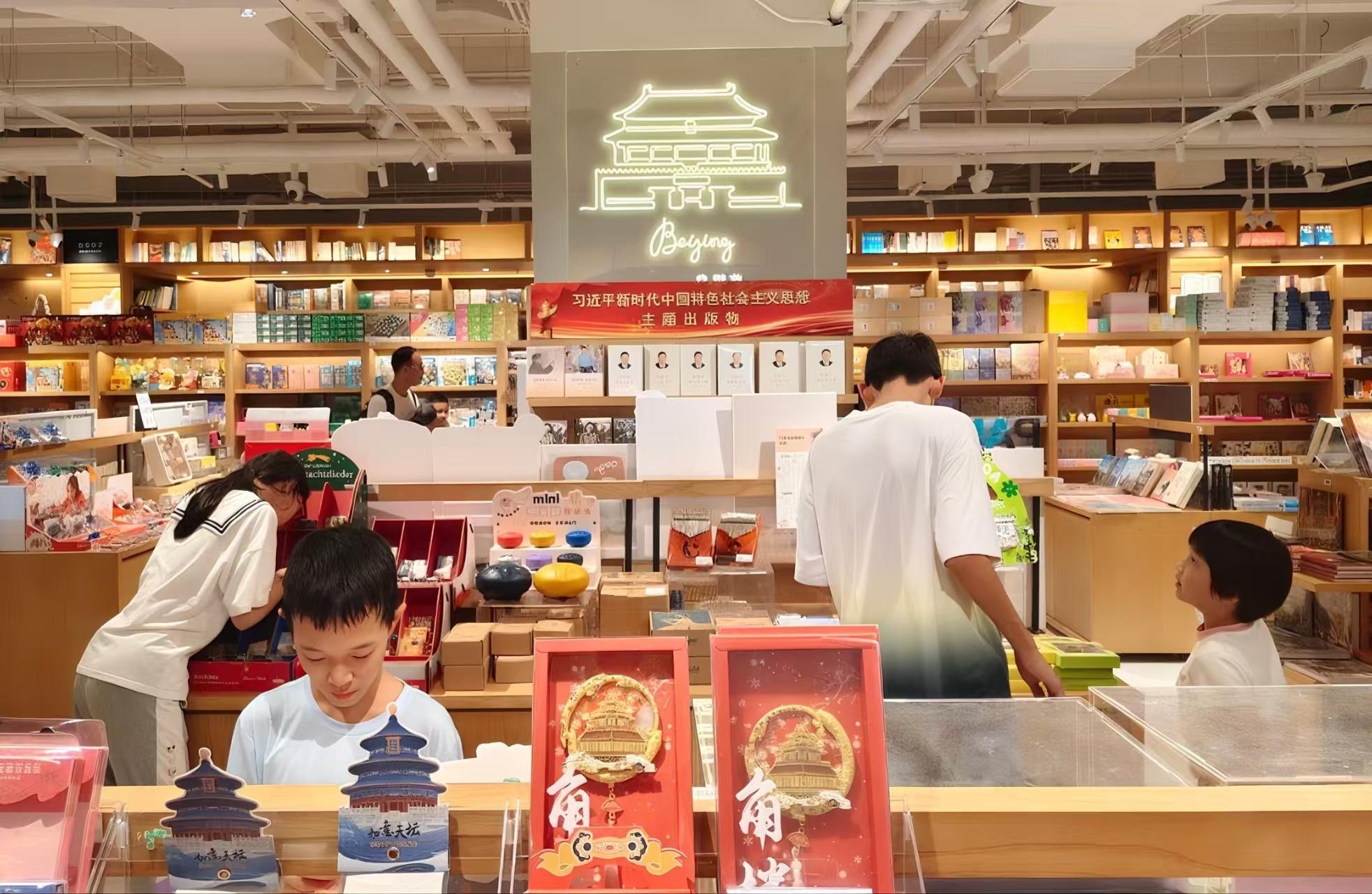 在实体书店转型过程中,空间美学设计成为吸引客流的重要因素。在北京,作为王府井商圈的文化地标,PAGEONE书店王府井店以地域文化为设计核心,总面积约500平方米的空间按元大都“汗八里”城郭格局规划为“内城—外城”分层布局,中央“内城”集中陈列文化产品,以天安门标志强化北京地域符号;外圈“外城”为环形书廊,按社科、文学、儿童读物等类别摆放图书。工作人员介绍说:“外国游客占比差不多四分之一,所以门口特意上架了中轴线相关的双语书籍和纯英文书籍,文创产品也多是北京景点冰箱贴、拼装八音盒这类带本地元素的,就是为了更好满足游客需求。”